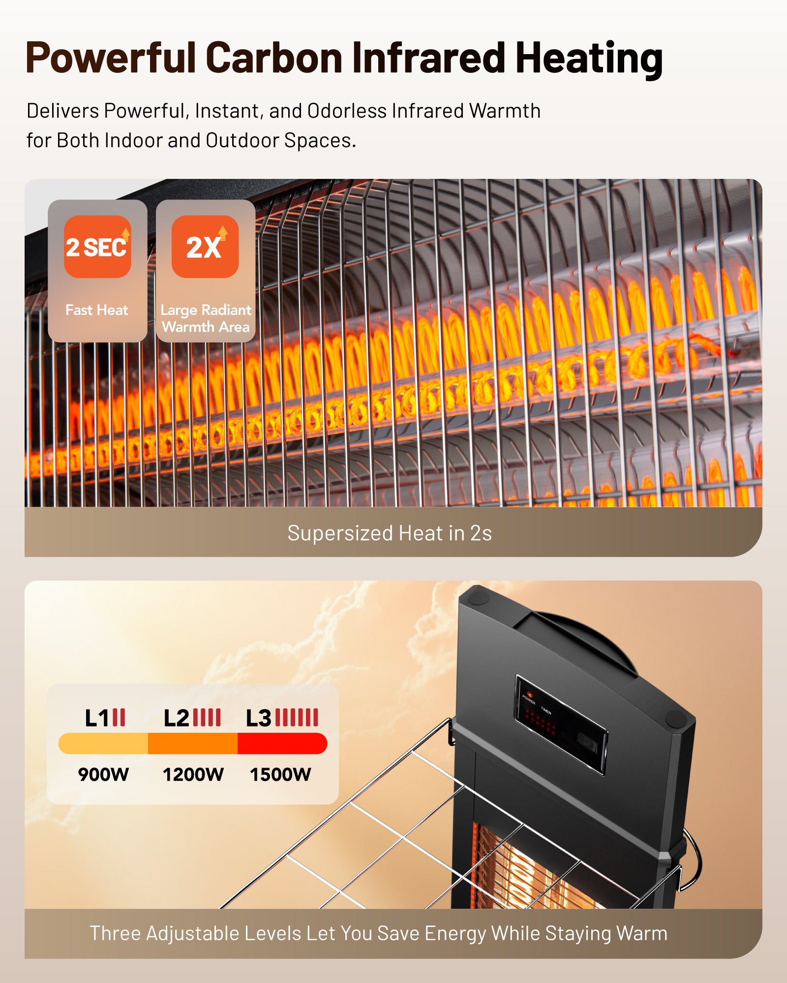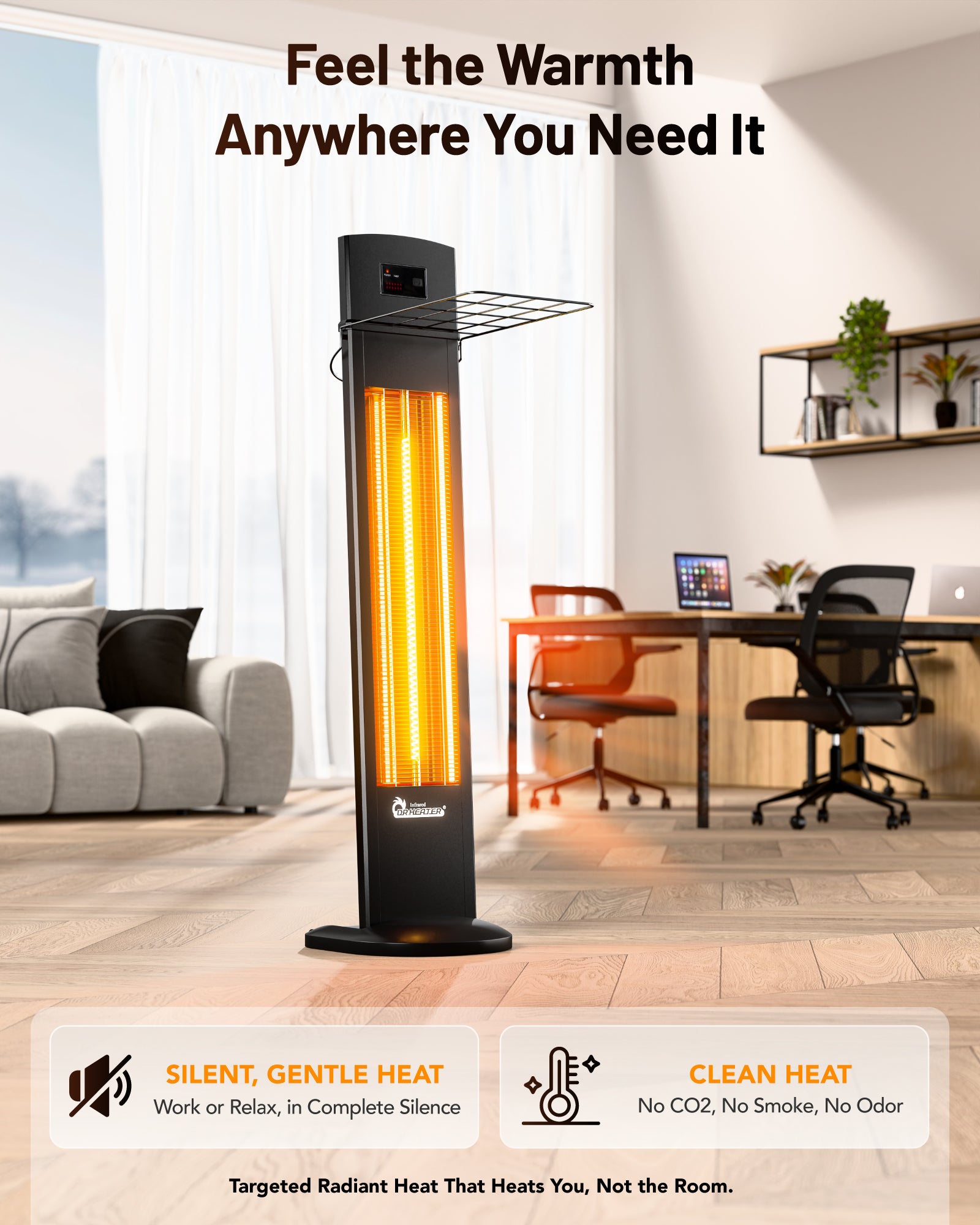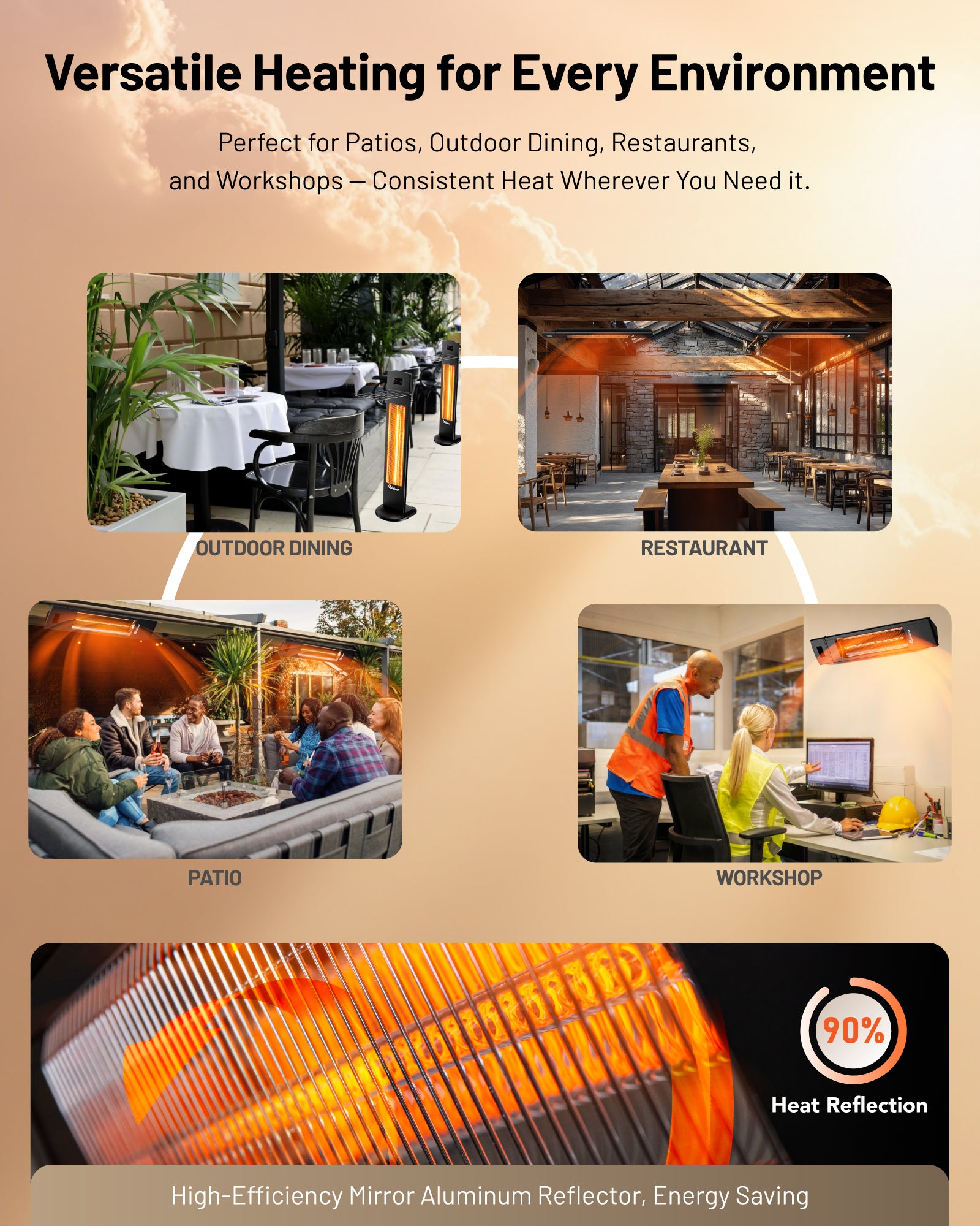 - ✔ Superior Heat Distribution: Unlike traditional heaters that waste energy heating the air, our high-efficiency carbon infrared element and 90% reflective mirror aluminum reflector directly warm people and objects for faster, more efficient, and deeper heat penetration