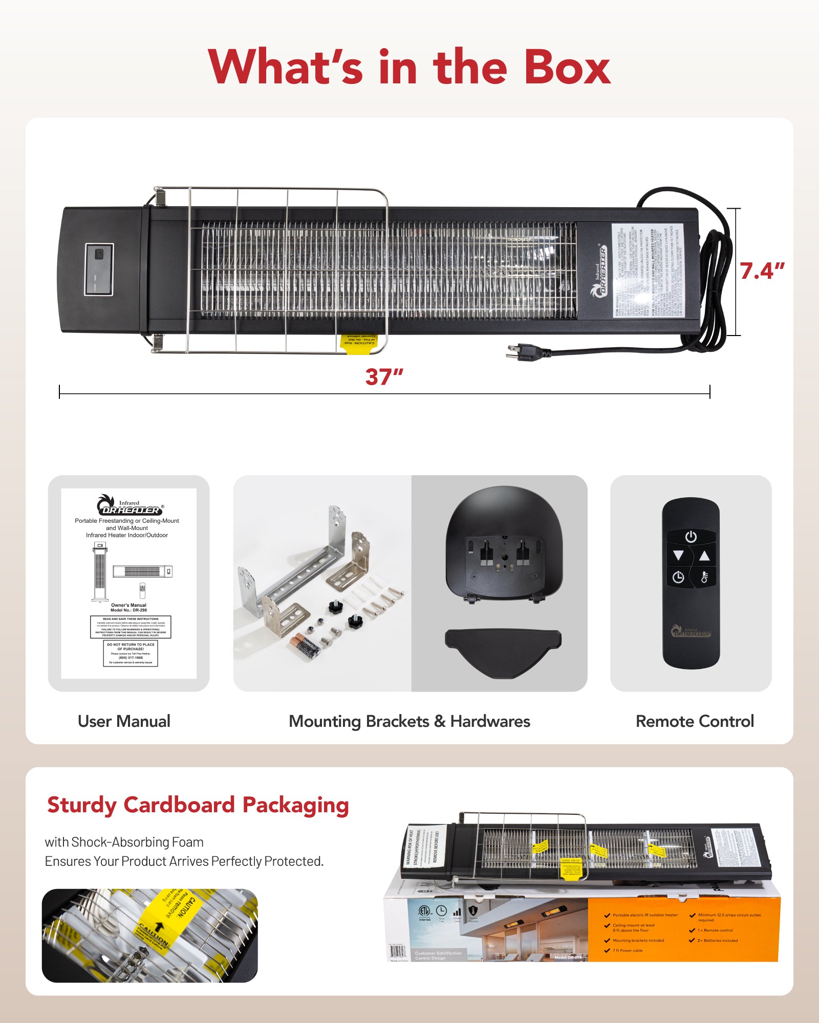 DR-298 - DR. INFRARED HEATER DR-298 Freestanding Portable Infrared Space Heater, 1500W Indoor Outdoor Use, Wall/Ceiling Mountable, Remote Control, 3 Heat Settings, Timer, Tip-Over & Overheat Protection, Black